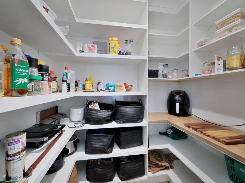 Modern Kitchen with walk in pantry, electric cooktop and dishwasher.